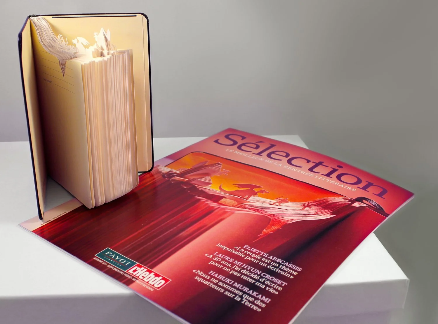 Le thème de ce concours était le voyage à travers le livre. A l'aide, d'un scalpel et de quelques plans préliminaires, j'ai découpé des histoires, page par page dans des carnets Moleskine. Ainsi, la découpe à la main et la singularité du passage de la lame d'une page à l'autre, donne vie aux divers éléments de ces petites scènes lorsqu'on ouvre le carnet.