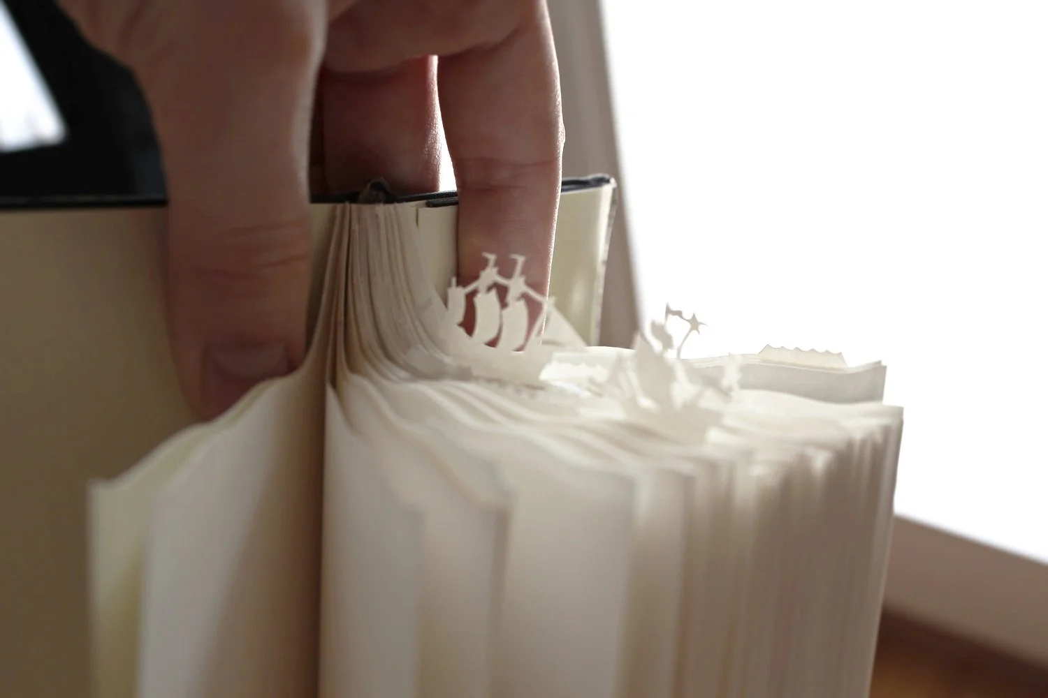 Travelling trough books was the contest theme. With preliminary sketches and a scalpel, I simply cut stories out of the Moleskine books, one page at a time. The unique shape is due by the irregularity of the hand cutting page after page, giving life to the elements in these tiny scenes when opening the books.