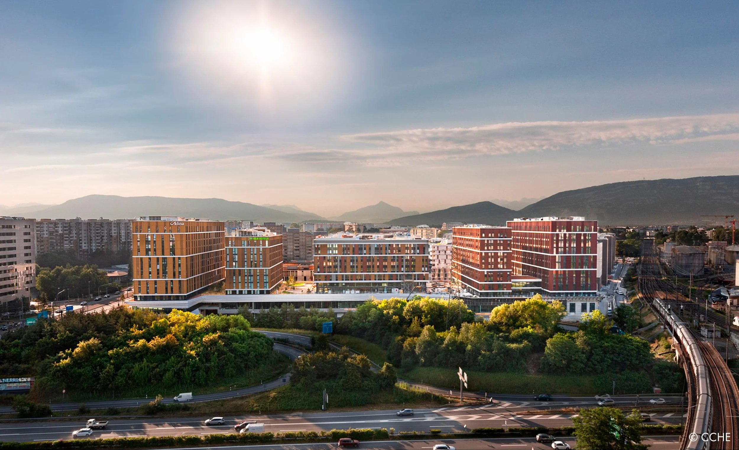 Réalisation du concept d’orientation de l’îlot A du Quartier de l’Étang à Vernier, comprenant 5 émergences de 12 étages, reliées par un parking sous-terrain traversant, sur 3 niveaux.